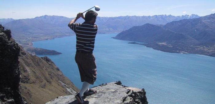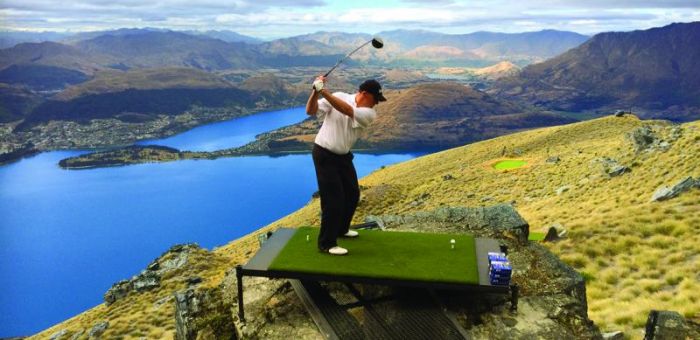 Nestled at 4500 feet in the Southern Alps of New Zealand this par 3 unique golf experience overlooking Queenstown has 3 tee boxes for the altitude golfer to attempt their hole in one. With Over The Top helicopter access only, players will fly in, drive, chip, and putt out on the top.